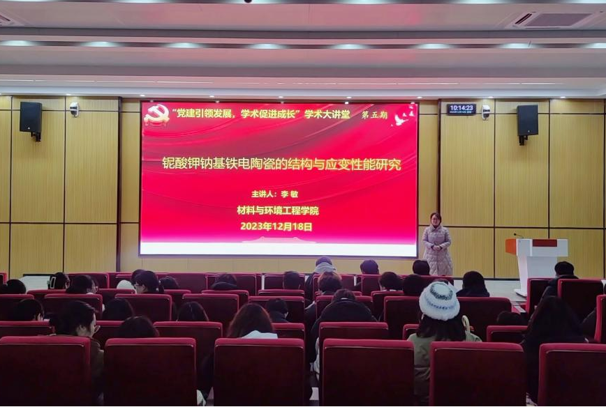12月18日上午,材料与环境工程学院“党建引领发展,学术促进成长”学术大讲堂第五期在公共教学楼东报告厅开讲。材料与环境工程学院副教授李敏以“我心向党,强国有我”为题的微党课开场,后开展“铌酸钾钠基铁电陶瓷的结构与应变性能研究”为题的学术报告。材料化学教研室党员教师和学生代表100余人参加了报告会。