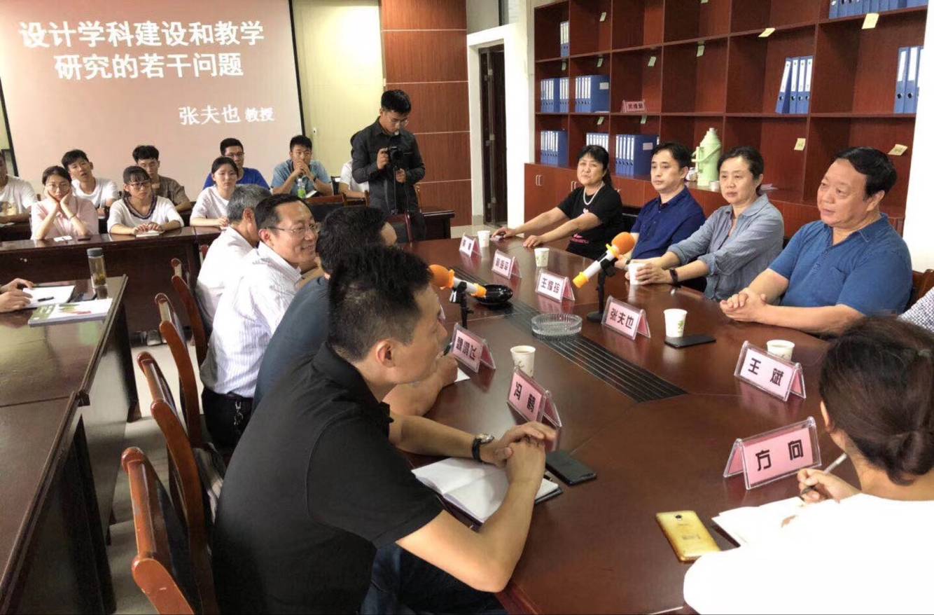 9月13日,著名艺术理论家清华大学美术学院博导张夫也教授、王耀玲教授、中国工艺美术学会秘书长王斌先生、金牌盛典国际会展集团董事长戴海平先生莅临美术与设计学院指导交流。会议由副校长汪贤才主持,美术与设计学院全体教师及部分学生代表出席了会议。