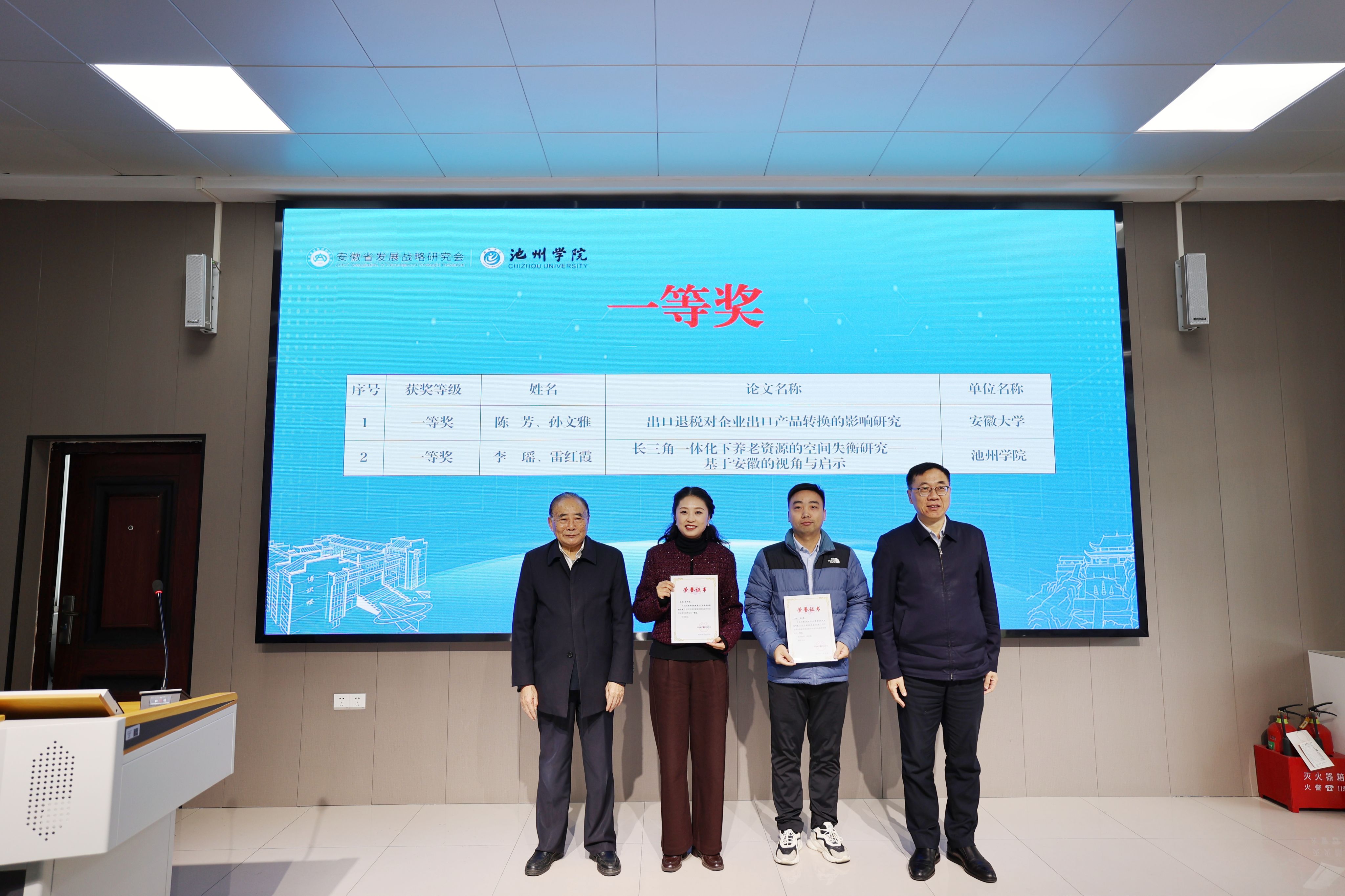 开幕式上,与会领导嘉宾集体合影,并为安徽省发展战略研究会年会青年优秀论文获奖者颁奖。beat365四篇论文获奖,其中,《长三角一体化下养老资源的空间失衡研究——基于安徽的视角与启示》获得一等奖(作者:李瑶、雷红霞),《多模态AI数字人的用户体验与员工满意度提升策略》获得二等奖(作者:华潮、王思甜、吴自爱),《乡村旅游资源高质量开发利用的驱动逻辑、困境与路径选择——基于新旅游资源观视角的思考》获得三等奖(作者:刘飞、华潮),罗娟老师获得学术新星奖。