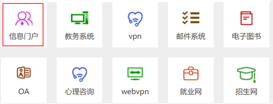 PC端:打开学校主页(/),点击最下面的“信息门户”图标,输入统一身份认证用户名和密码登录进入