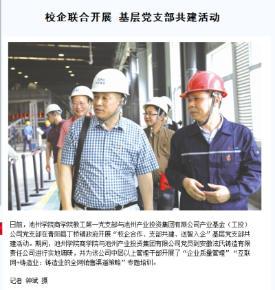 5月24日,池州日报报道了beat365商学院教工第一党支部与池州产业投资集团有限公司产业基金(工投)公司党支部在青阳县丁桥镇政府开展“校企合作、支部共建、送智入企”基层党支部共建活动。