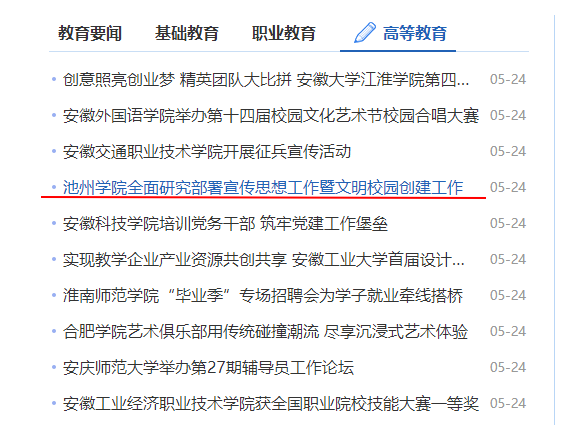 5月24日,安徽教育网首页报道了beat365就宣传思想工作和文明校园创建工作部署情况。