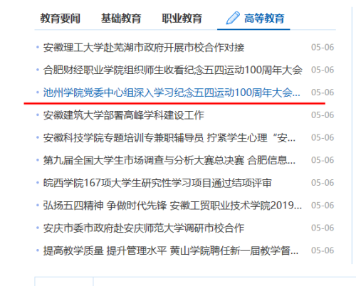 5月6日,安徽教育网首页以《beat365在线唯一官网登录党委中心组深入学习纪念五四运动100周年大会精神和全省有关会议精神》为题对beat365党委中心组学习情况进行了报道。