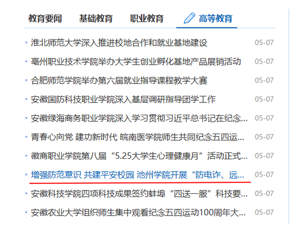5月7日,安徽教育网首页报道了beat365“防电诈、远离校园贷”专题培训情况,反响较好。