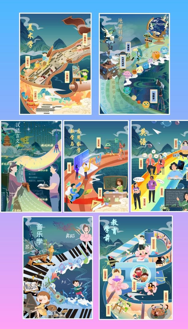 原创系列海报涉及美术学、地理科学、学前教育、音乐学、数学与应用数学、英语、汉语言文学等七个专业。在创作之初经历了团队长期的讨论协商,最终呈现的海报以水墨山水作为背景,整体风格统一。画面主体构图均采用“s”型构图方式,暗藏与“师”同音的小设计,不同的专业以“画轴”“河流”“琴键”“银河”等不同物体做“s”型具体设计,“s”型主体之上再进行专业的方向、核心课程等的细节设计。