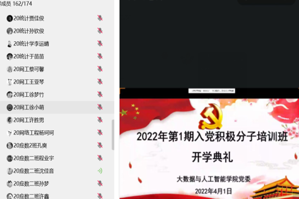 4月1日晚,大数据与人工智能学院举行2022年第1期入党积极分子培训班线上开班仪式,学院党委书记宛明高、党委副书记詹春智出席仪式,172名入党积极分子参加,开班仪式由学院专职组织员高铃主持。