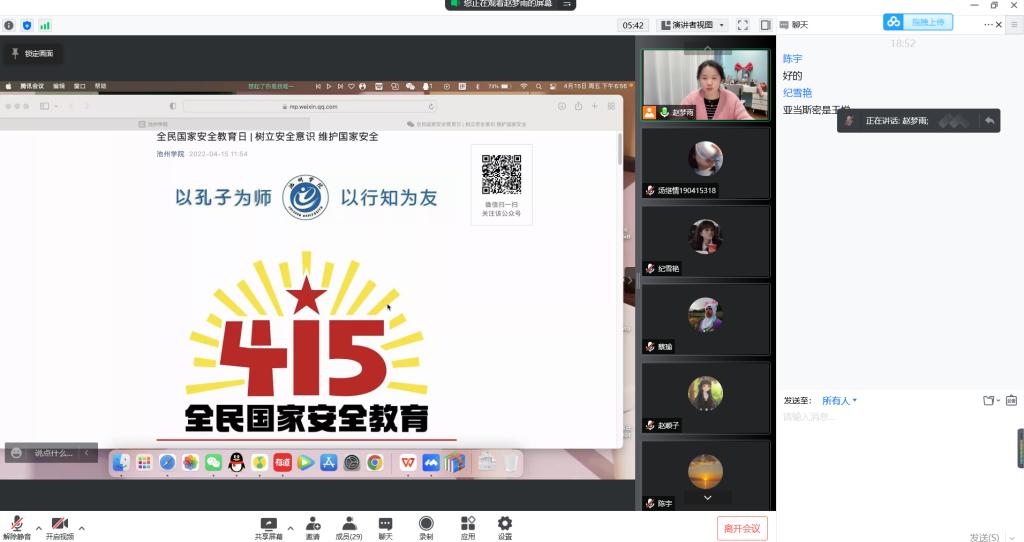 此外,还组织学生收看了中国青年报网4.15全民国家安全教育日访谈节目“大安全观与青年”、参与知识问答、举行主题党日、团日活动等。