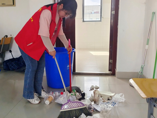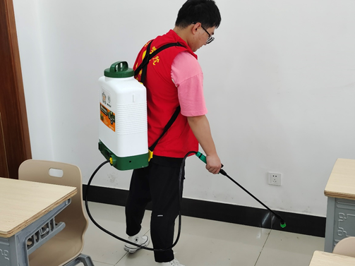 4月23日,志愿者们分组带上抹布、扫把、消毒喷壶等清洁工具到公共教学楼开展文明创建志愿服务。活动中,志愿者共分为四组,分别是黑板清洗组、垃圾清理组、消毒除菌组和桌椅清洁组。志愿者们干劲十足,用清洁剂对黑板和桌椅进行彻底的清洗、用消毒剂对教学楼和办公室逐层逐间进行喷洒,为同学们创造整洁卫生的校园环境。