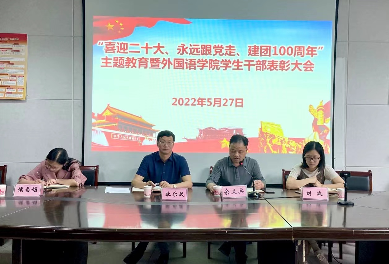 5月27日下午外国语学院举办“喜迎二十大,永远跟党走,奋进新征程”主题教育暨外国语学院学生干部表彰大会,总结回顾学院共青团工作、表彰先进集体和个人。外国语学院党委书记张乐民,院长余义兵等出席活动,团委书记查庆蘋主持。