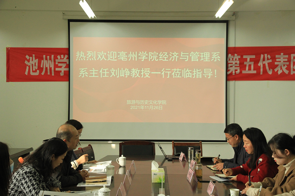 11月26日上午,亳州学院经济与管理系主任刘峥教授一行4人来旅游与历史文化学院考察交流,院长胡文海教授、院党委书记程晓丽教授、教学办公室主任蒋辉、实训中心主任钟奇峰、酒店管理教研室主任吴琼、余菲菲副教授及部分专业老师参加交流会。