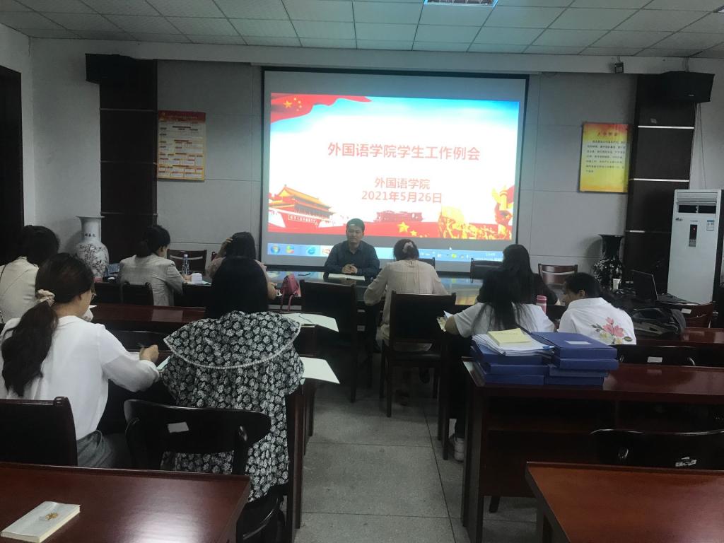 5月26日下午,外国语学院在会议室举行学生工作例会,通报期中学生工作检查情况、研究部署近期工作。会议由院党委副书记刘军主持。全体辅导员参加了此次会议。