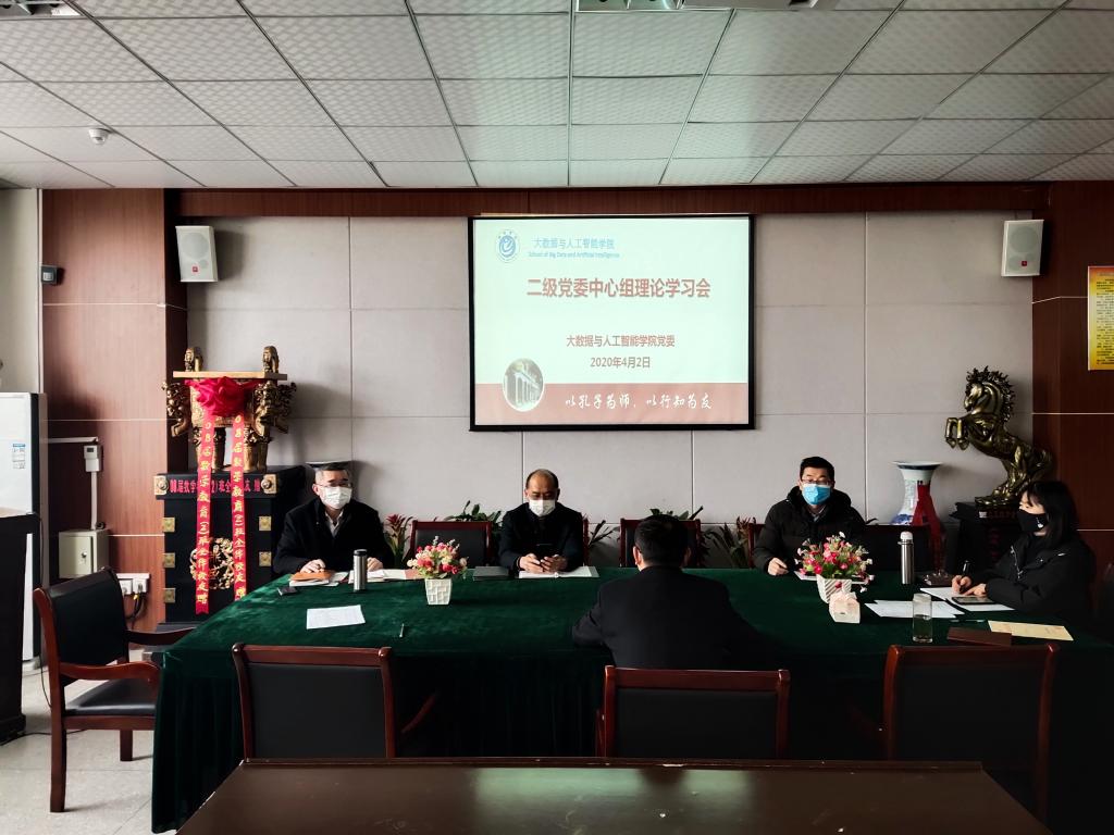 4月2日下午,大数据与人工智能学院在博弈南一楼会议室召开中心组理论学习会,会议采用线上线下相结合的方式进行,院党政领导班子、科级以上干部参加会议,会议由院党委书记宛明高主持。