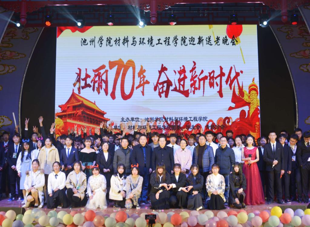 12月9日,材料与环境工程学院“壮丽七十年,奋进新时代”迎新晚会在博古礼堂隆重举行。校党委书记孙晓峰出席晚会,校团委书记程海峰,学生处副处长(主持)方文利,学生处副处长吴国志,材料与环境工程学院党委书记何贵林,副院长汪鹏飞以及学院师生代表近500人参加了本次晚会。