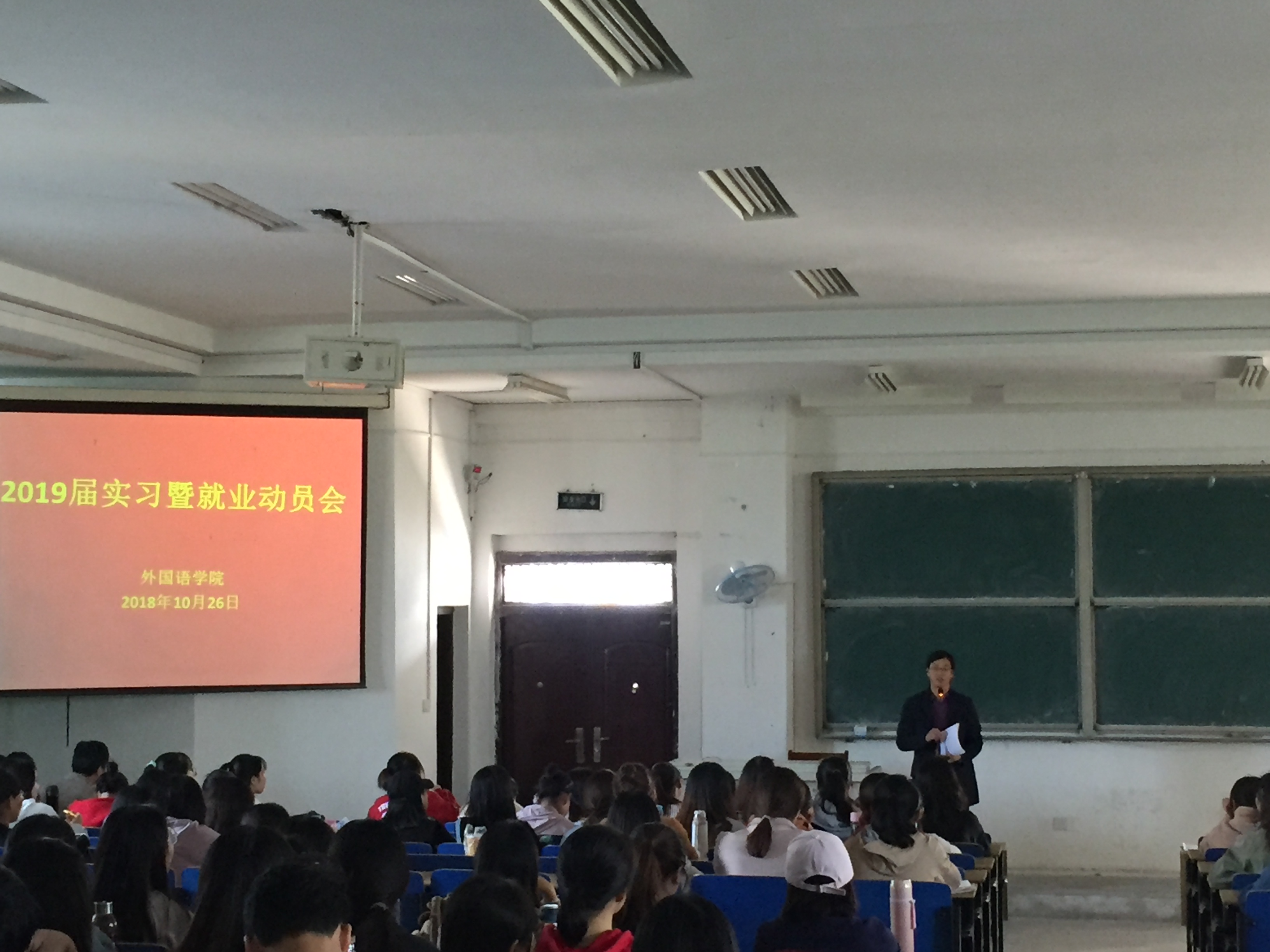 为更好地做好2019届毕业生实习和就业工作,10月26日下午,外国语学院在博弈楼2楼阶梯教室举行2019届毕业生实习暨就业动员会。参加会议的有外国语学院党总支书记张乐民、副书记冯淑慧、院长助理刘军、2019届毕业班全体辅导员和学生,会议由冯淑慧主持。