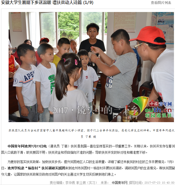 本次活动以义务服务和科学调研为主体,开展系列实践活动:深入调查清溪河水质和后场村秸秆回收,切实帮助杨街村扶贫,见习科技创新产品,同时尽己所能,利用自己的专业知识及平时积累的经验来帮助留守儿童,慰问孤寡老人,切切实实为老百姓做事。在贵池区组织部领导的大力支持下,学院深入开展赴贵池区杨街村扶贫调研实践活动,活动照片入选第八期中国共青团杂志封底,也是安徽省唯一入选的暑期实践团队。