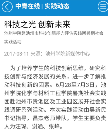 第八期中国共青团杂志封底、中国共青团杂志微博、中国青年报官网中青在线、中国青年网、安徽共青团微信公众号、安徽文明网、安徽青年网、安徽高校在线微信公众号、池州日报、贵池先锋网等多家媒体对活动进行了宣传报道。
