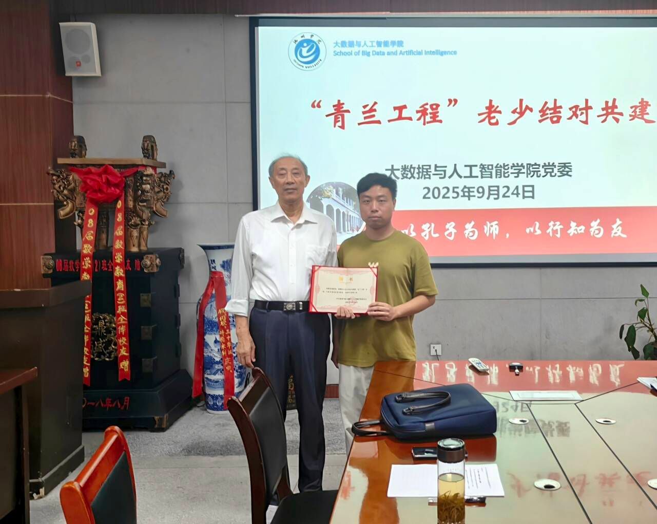 会上,詹春智为方康年同志颁发了“青兰工程”专家聘书。方康年与学院专职辅导员周子豪结成“老少搭档”,通过“传、帮、带”的形式,在学生思想政治教育工作中实现经验传承,推动育人工作取得新的成效。