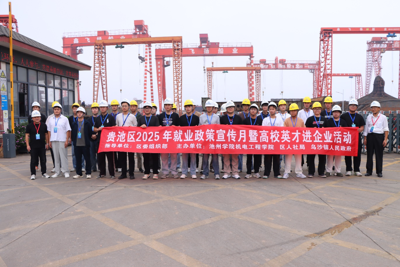 2025年9月27日,机电工程学院联合贵池区人社局、乌沙镇人民政府,共同开展“高校英才进企业”活动,组织毕业班学生走进贵池船舶工业基地,实地感知产业前沿,拓宽职业视野。