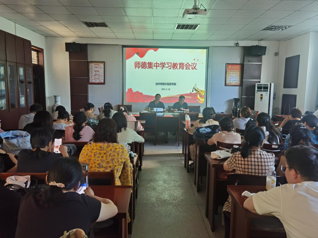 6月28日,外国语学院在院会议室举行师德集中学习教育会议,学院领导班子和全体教职工出席会议,会议由学院党委书记张乐民主持。