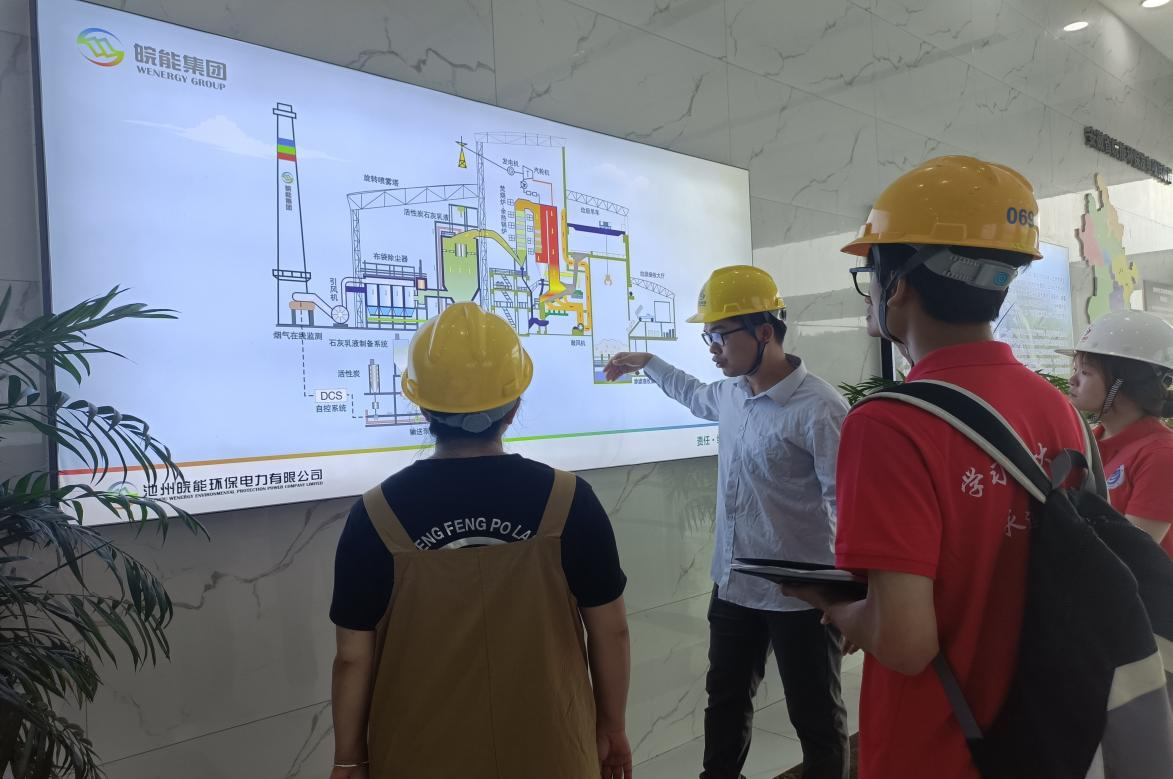 在池州市皖能环保电力有限公司,实践团参观了垃圾回收到发电的整个过程,技术人员结合监控视频和实时数据讲解,队员了解了生活垃圾焚烧发电项目建设标准、生产工艺以及炉渣、烟气、渗滤液、飞灰处置工艺。堆积如山的生活垃圾在发酵3-5天后被吊机抓起,一批批投入进料口,送入焚烧炉,经燃烧将热能转化为蒸气,最后输送到汽轮机,带动发电机产生电能,从而使得生活垃圾真正实现无害化、减量化和资源化。