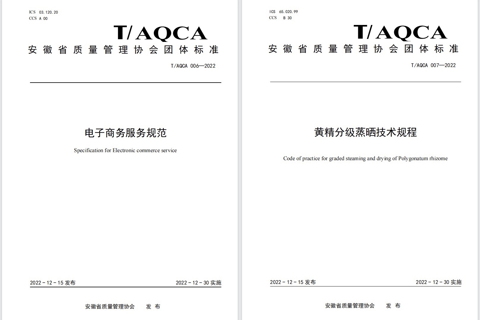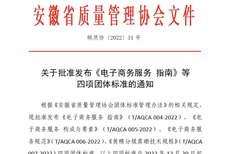 12月15日,安徽省质量管理协会发布2022年第31号文件,由beat365在线唯一官网登录商学院、beat365在线唯一官网登录电子商务服务地方研究中心牵头制定的《电子商务服务 指南》(T/AQCA 004-2022)、《电子商务服务 构成与要素》(T/AQCA 005-2022)、《电子商务服务规范》(T/AQCA 006-2022 )、《黄精分级蒸晒技术规程》(T/AQCA007-2022)四项团体标准批准发布,该标准自2022年12月30日起实施。