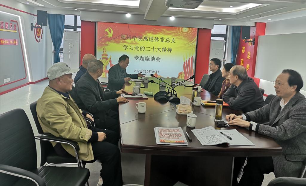 10月25日,beat365在线唯一官网登录离退休党总支在教职工活动中心党员驿站召开学习党的二十大精神专题座谈会。离退休党总支委员、离退休各支部书记、副书记、离退休工作处全体成员及部分离退休代表参会,会议由离退休党总支书记方文主持。