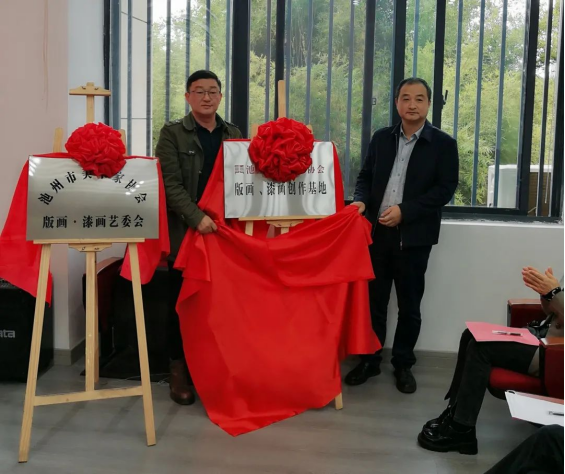 范福安、陆可为“池州市美术家协会版画、漆画艺委会”揭牌;王屹、魏鸿飞为“池州市美术家协会版画、漆画创作基地”揭牌。