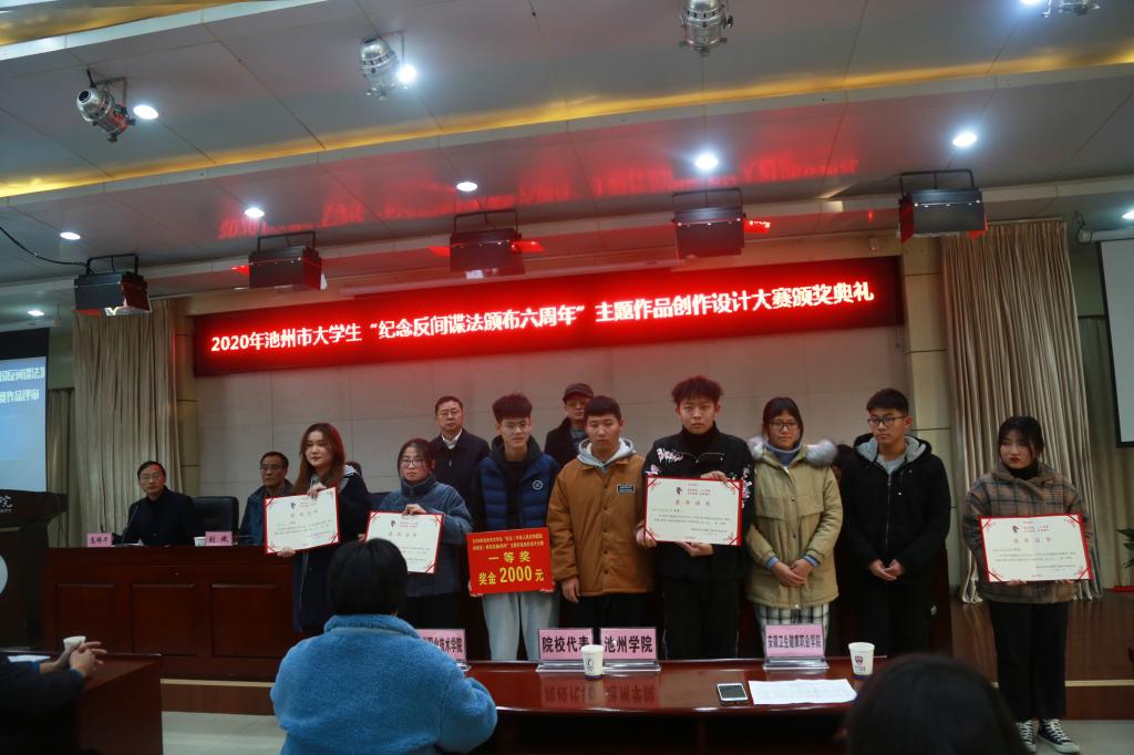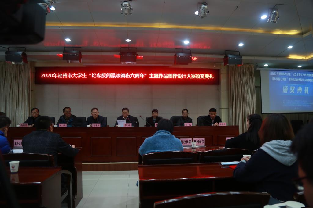 11月30日下午,由池州市法治宣传教育工作领导小组办公室主办,beat365在线唯一官网登录、池州职业技术学院、安徽卫生健康职业学院承办,池州市广告协会协办的2020年池州市大学生“纪念反间谍法颁布六周年”主题作品创作设计大赛颁奖典礼在beat365行政南二楼会议室举行。