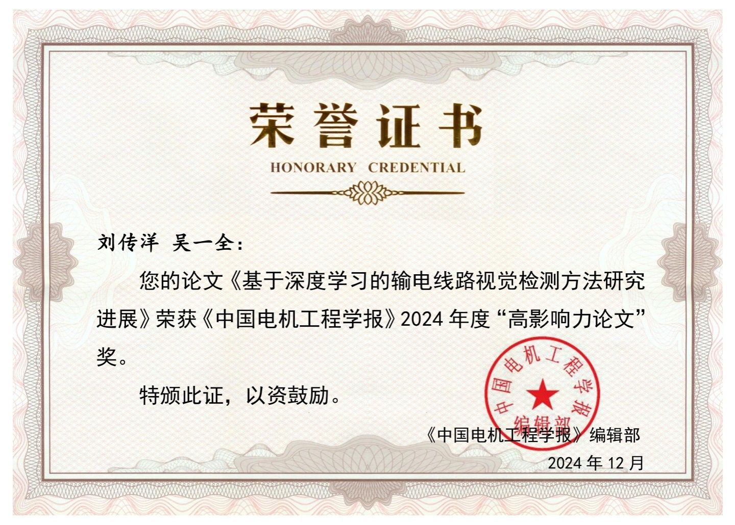 他的核心研究方向——基于红外图像和深度学习的输电线路视觉检测与发热故障诊断,精准对接国家智能电网建设和新能源发展战略中的迫切需求。“传统人工巡检面临地形复杂、效率低下且存在高空作业风险等问题。”刘传洋解释道,“我们的研究,就是希望通过无人机搭载高清摄像头、红外热像仪等设备,结合AI图像识别技术,实现高效、精准的自动化巡检。”谈及选择这一方向的契机,他归功于导师的深远影响。“导师在电机工程图像领域的研究启发了我。他常说:‘让技术落地,服务社会发展。’”2024年,他以第一作者身份发表在《中国电机工程学报》上的论文荣获“高影响力论文”奖,该研究系统综述了深度学习在输电线路视觉检测中的应用,体现了学术研究与国家需求的结合。