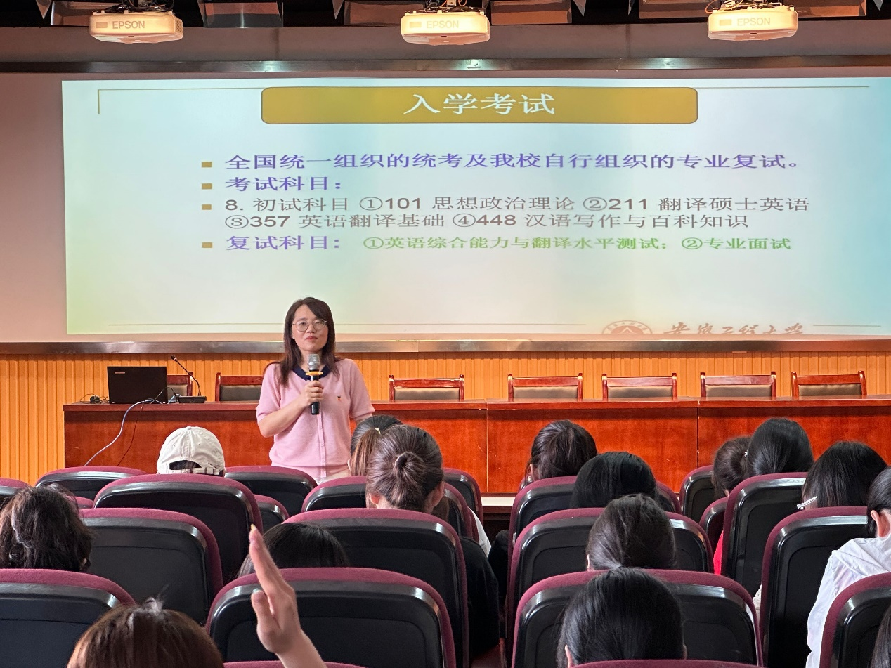 韩利敏介绍了学校的发展历程、学科优势及研究生培养特色,重点解读了翻译硕士研究生招生政策、奖助体系及就业前景。她表示,安徽工程大学beat365平台唯一官网高度重视研究生教育,致力于培养具有创新精神和实践能力的高层次人才,欢迎我院优秀学子报考。