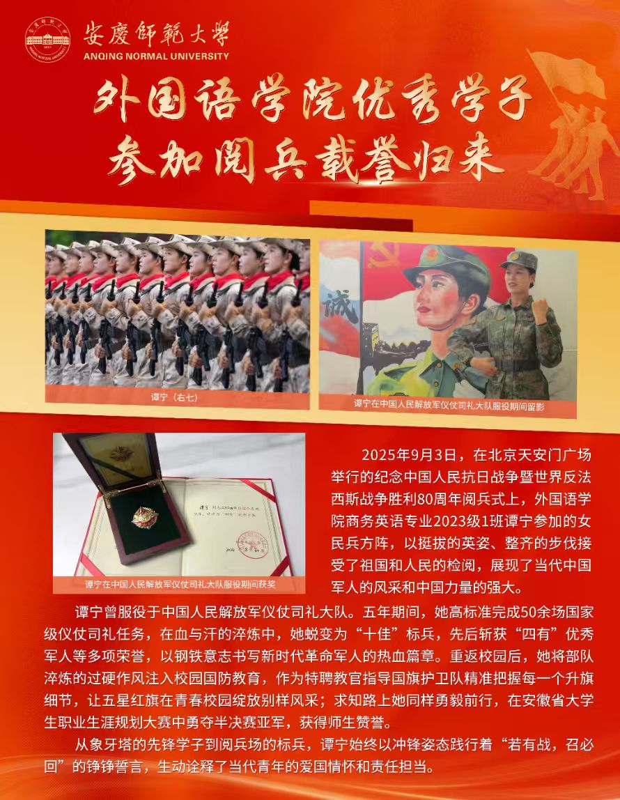 beat365平台唯一官网将思想政治教育与爱国主义教育融入迎新环节,将商务英语2023级专业(1)班谭宁同学参加“9·3”大阅兵的光荣事迹以图文并茂的形式制成专题展板,生动展现学院学子昂扬向上的精神风貌。展板内容包括在天安门广场受阅瞬间、在中国人民解放军仪仗司礼大队服役期间的经历及所获荣誉等。谭宁表示,军队经历培养了她的纪律性和责任感,而校园生活则给予她专业知识和综合素养;她希望将来能发挥语言专业优势,结合军队经验,在外事交流或国际传播领域为国家作出贡献。
