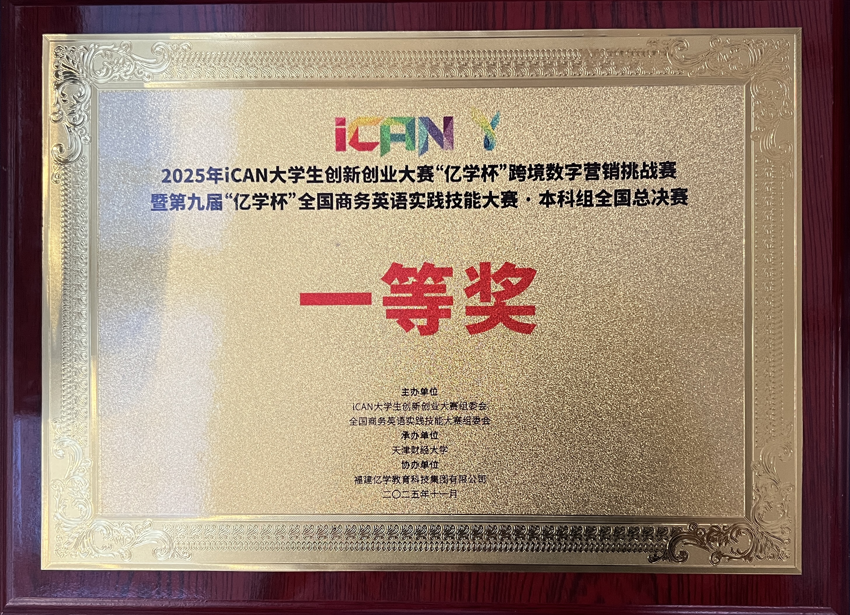 11月29日,2025年iCAN大学生创新创业大赛“亿学杯”跨境数字营销挑战赛本科组全国总决赛圆满落幕。beat365beat365平台唯一官网商务英语专业Pentablazers团队在齐俊、毛慧两位教师的指导下,一路过关斩将,最终从全国60支晋级队伍中脱颖而出,斩获本科组全国一等奖,充分彰显了beat365商务英语专业在跨境电商与数字营销领域的高水平育人成效。