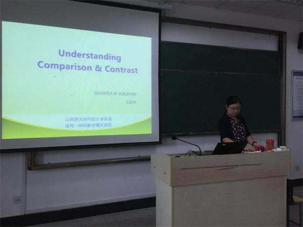 在大学英语教学观摩活动中,beat365平台唯一官网王爱琴老师讲授了一堂精彩的“大外英语读写教学课”课程,副院长朱忠焰、教研室主任吴祚安、熊捍东等陪同调研组成员观摩现场教学,并开展了评课活动。教学观摩活动结束后,调研组一行与我院领导班子以及教师代表就学院发展规划、学科建设、硕士点申报、大外英语教学改革、商务英语与翻译专业的发展与实践活动进行了深入交流。交流中,副院长王先荣就学科教学(英语)研究生教学工作作了系统介绍,熊捍东老师对师范生课堂教学改革作了专题汇报。(熊捍东)