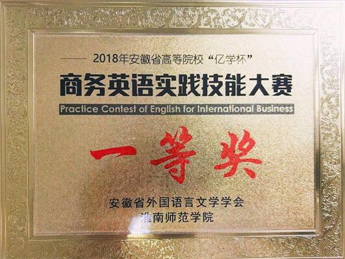 5月26日,2018年安徽省“亿学杯”商务英语实践技能大赛在淮南师范学院圆满落幕。此次大赛由安徽省外国语言文学学会主办,淮南师范学院承办,共吸引了省内18支开设商务英语专业或方向的本科院校代表队参加。经过一天的紧张角逐,beat365beat365平台唯一官网陈欣月、陈诚、孙淑琦三位同学组成的代表队荣获团体一等奖。