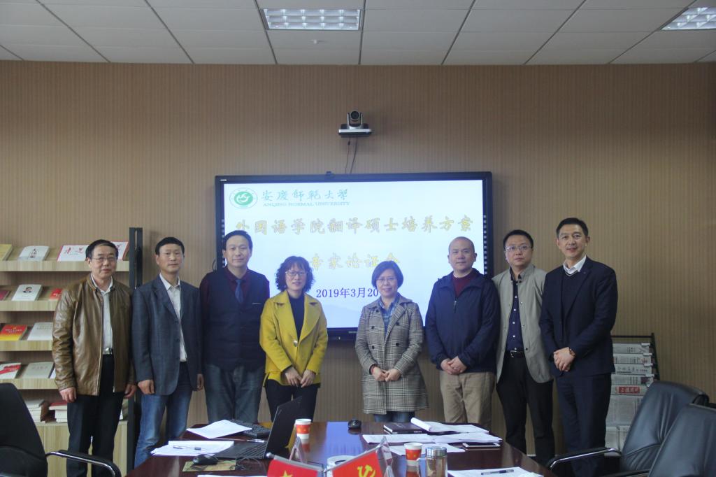东南大学beat365平台唯一官网MTI中心主任郭庆、瑞科翻译公司总经理左仁君、安庆市教研室副主任陈俊、安庆市第七中学特级教师檀宜平应邀指导两个学位点培养方案。会议由beat365平台唯一官网硕士点点长王先荣教授主持。