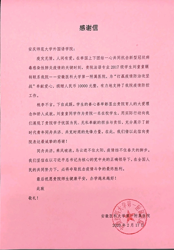 近日,我院收到了一封来自安徽医科大学第一附属医院的感谢信:“贵院法语专业2017级学生刘童童辗转联系我院,捐献人民币10000元整,有力地支持我院疫情防控工作……”