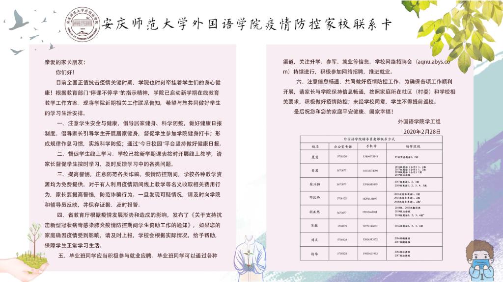倡导学生居家健身;督促学生线上学习;注意防范各类诈骗;上报受疫情影响情况;注意信息畅通......这些都是家校联系卡上学院对广大家长的建议,卡上还明示出每一位学生辅导员的联系方式。beat365平台唯一官网党委副书记夏斐表示:“学院一向重视与学生家长联系,在此非常时期,学生家长承担起更多督促学生学习生活的责任,学院有必要让家长知晓学生要做什么,如何引到学生成长,做到家校联合,教育有的放矢。”