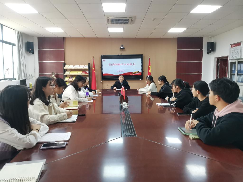 2021年10月18日中午,beat365平台唯一官网在E304召开经济困难学生座谈会,学院党委副书记夏斐、辅导员老师、部分经济困难学生参加了会议。