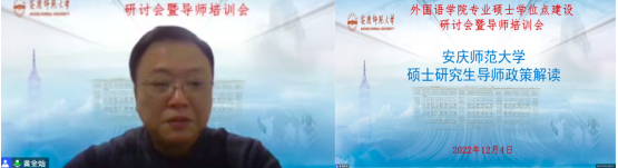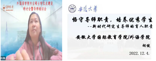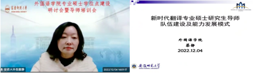 为深入学习宣传贯彻党的二十大精神,推进新时代研究生教育高质量发展,建设高素质研究生导师队伍,提升研究生导师指导水平,全面落实研究生导师立德树人职责,夯实我院翻译硕士和学科教学(英语)专业学位硕士点建设基础,12月4日下午外国语学院在腾讯会议平台召开硕士学位点建设研讨会暨硕士生导师培训会。安徽大学国际教育学院院长胡健教授、安徽师范大学beat365平台唯一官网副院长蔡静教授应邀参会并作专家报告。beat365平台唯一官网党政班子成员以及全体研究生导师、校外兼职导师、研究生共70余人参加了此次会议。会议由副院长黄全灿主持。