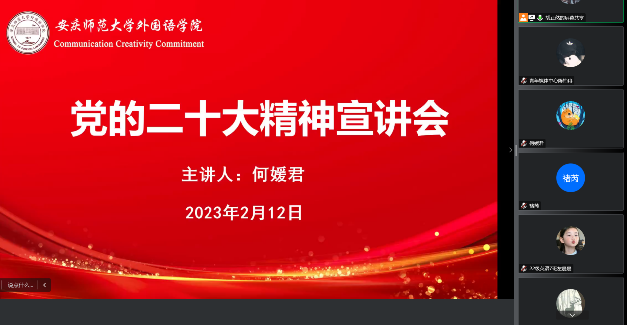 2月12日,学校青年讲师团成员、beat365平台唯一官网党委副书记何媛君作题为《学习宣传贯彻党的二十大精神,推动基层党团组织建设》线上宣讲报告会,会议旨在深入学习宣传贯彻党的二十大精神,坚决以中国化时代化的马克思主义武装头脑,法语、日语教研室党支部,翻译教研室党支部,青马班全体成员及第二期入团积极分子近100人参会。