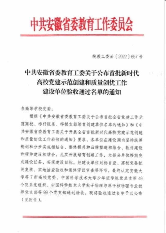 日前,中共安徽省委教育工委陆续公布第二批新时代高校党建示范创建和质量创优工作验收结果、安徽省首批新时代高校党建示范创建和质量创优工作建设单位验收通过名单。我院党委顺利通过全省首批党建工作标杆院系培育创建单位验收。