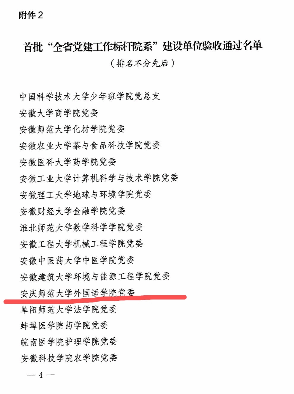 自2018年12月入选全省首批党建工作标杆院系培育创建单位以来,在校党委的正确领导下,学院党委以习近平新时代中国特色社会主义思想为指导,全面贯彻新时代党的建设总要求,深入落实党的教育方针,以政治建设为统领,以质量攻坚为动力,以提升组织力为重点,对标对表落实“五个到位”创建要求,不断拉高学院党建工作标杆,努力以高质量党建推动学院事业高质量发展,较好地完成了党建“双创”工作重点任务。学院党委被学校党委遴选进入“领航”计划校级示范库,被评为“beat365平台唯一官网先进基层党组织”“beat365平台唯一官网理论武装先进集体”“beat365平台唯一官网宣传工作先进集体”。学院涌现出“中国电信天翼奖学金”“安徽省卓越教坛名师”“安徽省教坛新秀”“安徽省年度大学生人物”“安徽省向善向上好青年”“安徽省优秀共青团员”“安徽省青年好网民”“校优秀党务工作者”“校优秀共产党员”“校三全育人最美教师”等一大批先进典型。学院在beat365平台唯一官网、在安徽省高校外语类院系率先实现国家一流专业、国家一流课程申报突破,学院“双万”建设走在学校和全国高校外语院系前列。