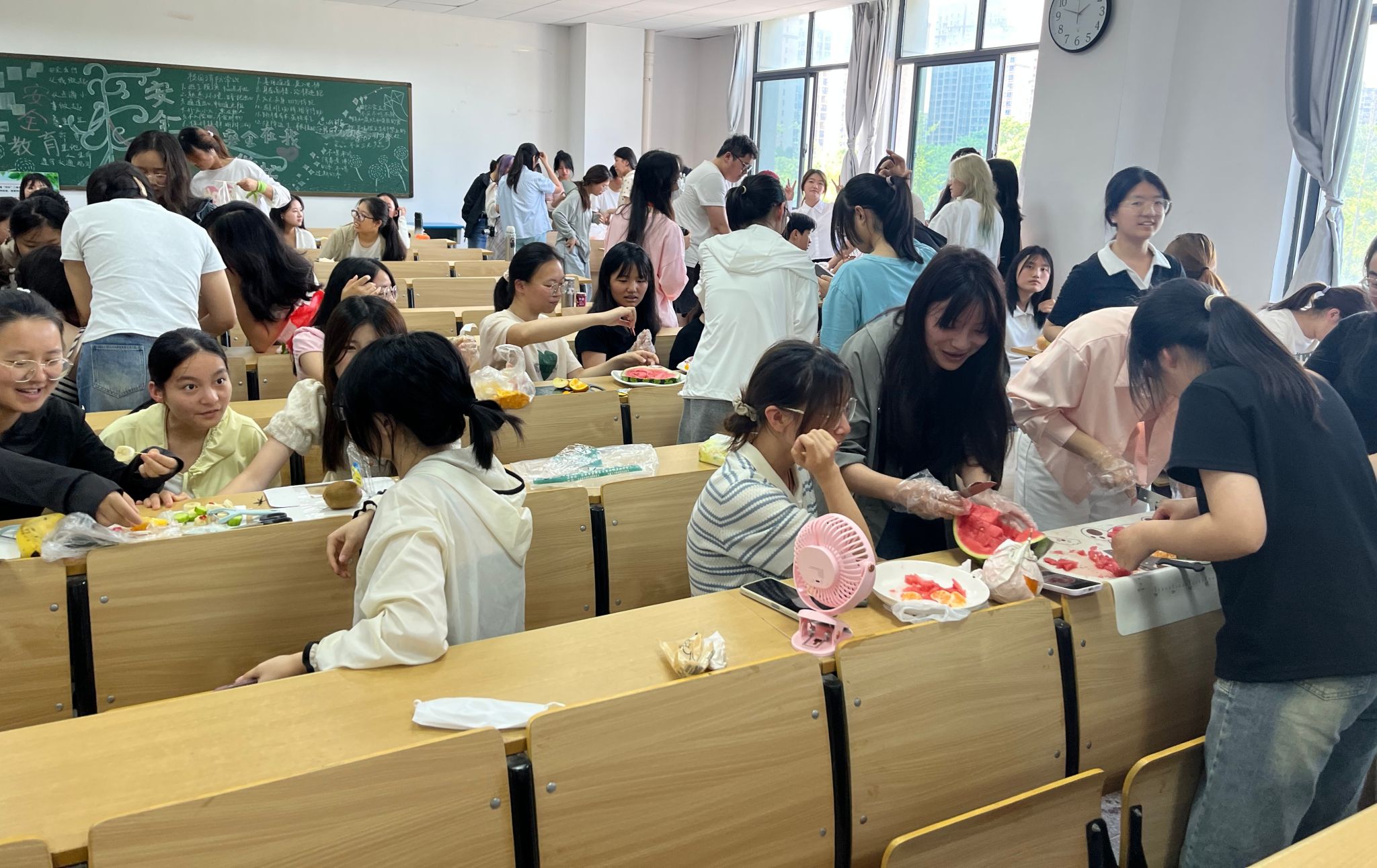 将橘子层层堆积,利用猕猴桃剪切出椰叶的形状,最后将西瓜“太阳”悬挂在椰树边,不同的元素组合成一幅和谐美丽的“海岛风光”一完成便吸引了众多学生的目光。“正值夏日,天气较为炎热,我们小队讨论后决定制作一个与夏日相符的水果拼盘设计。”英语(师范)专业2023(9)班的张心蕊表示,相较于传统的劳动教育实践,这次水果拼盘活动增加了许多趣味性,进一步调动学子积极性。