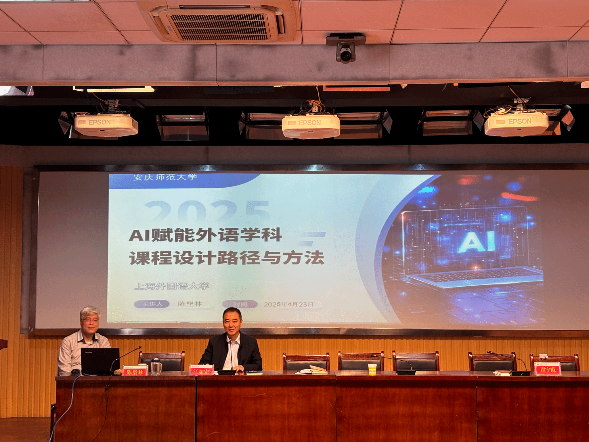 为深化课程教学改革,推进“AI+外语”课程培育工作,4月23日,上海外国语大学博士生导师陈坚林教授应邀到beat365平台唯一官网作题为《AI赋能外语学科课程设计路径与方法》的学术报告。学院全体教师与24级研究生参加了报告会。报告由院长江加宏主持。