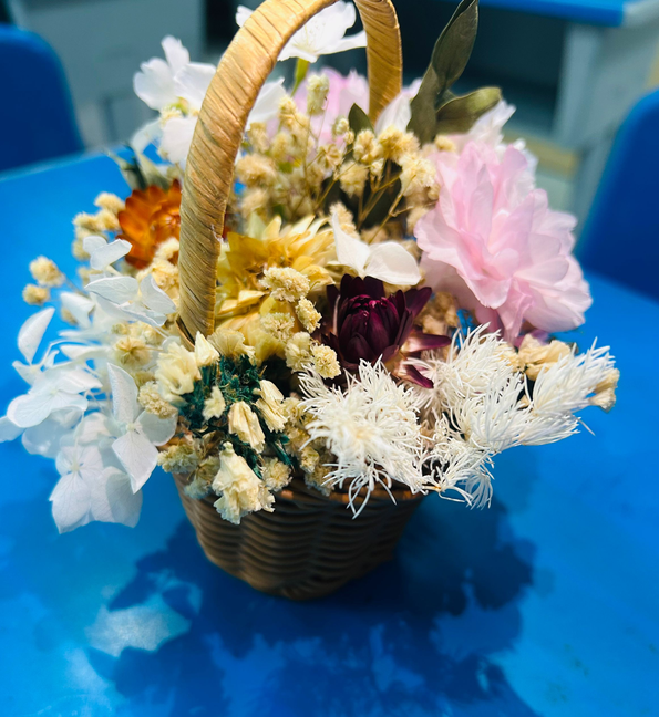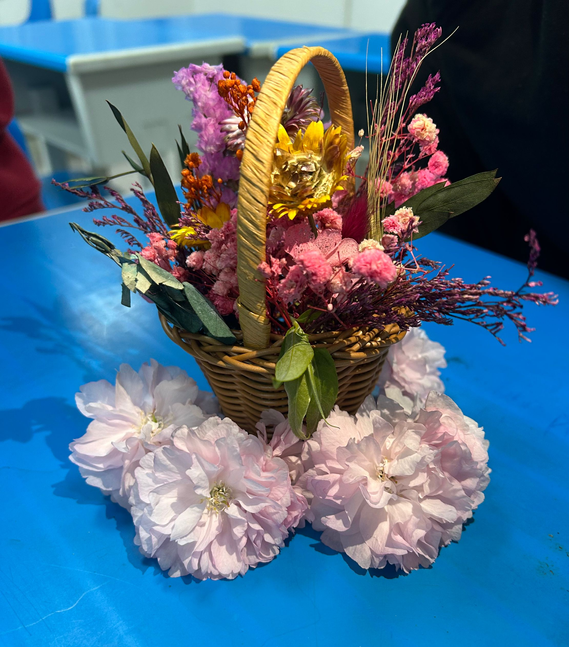 另一间教室内,一场“永不凋零的春日”正在上演。同学们先用绢布、铁丝和热熔胶制作仿生花:捻转铁丝为枝,剪裁绸缎为瓣,再用酒精灯轻烤花瓣边缘塑形,原本零散的材料逐渐化作玫瑰、铃兰与郁金香。紧接着,同学们一起将花插在花篮中,让花朵以另一种形式永生。