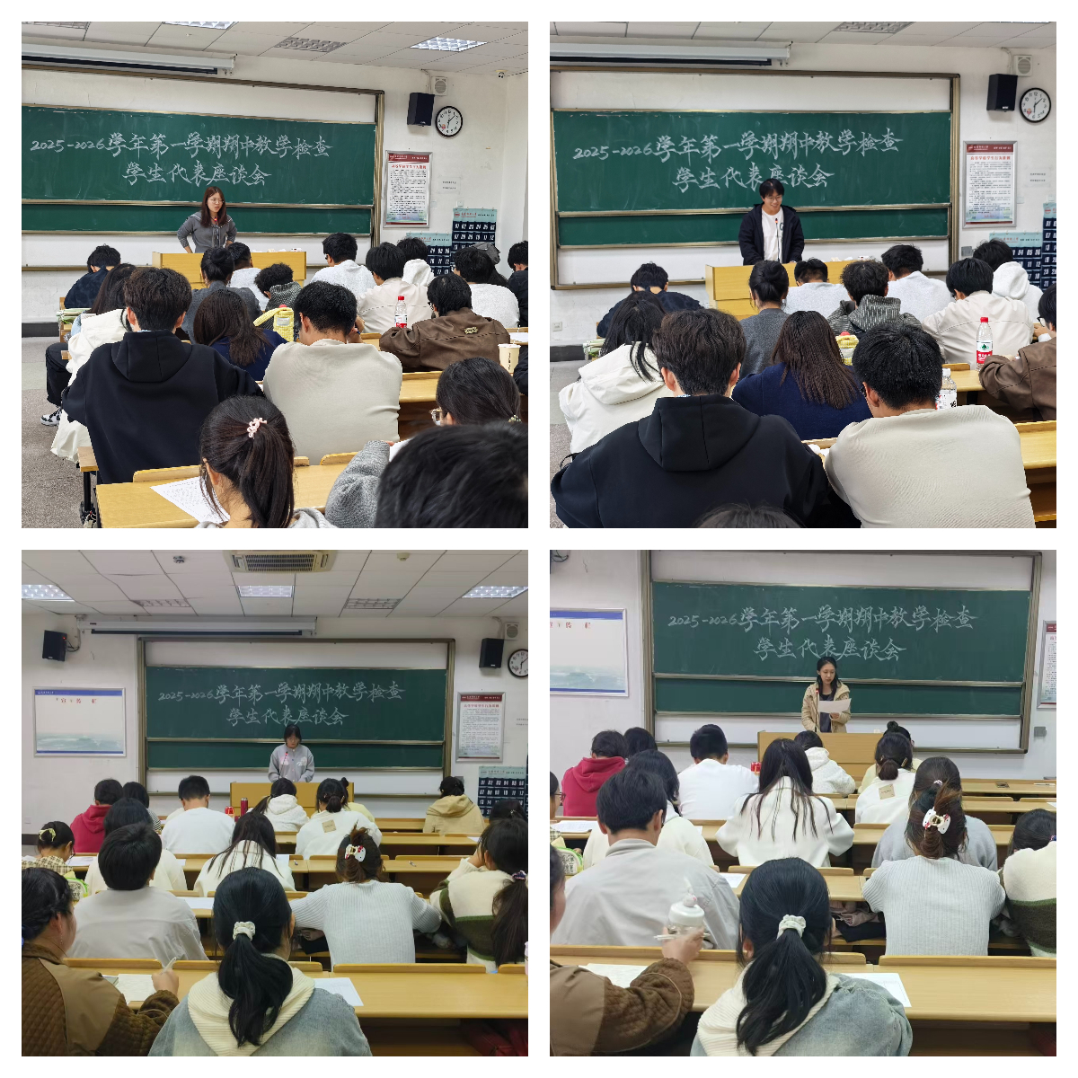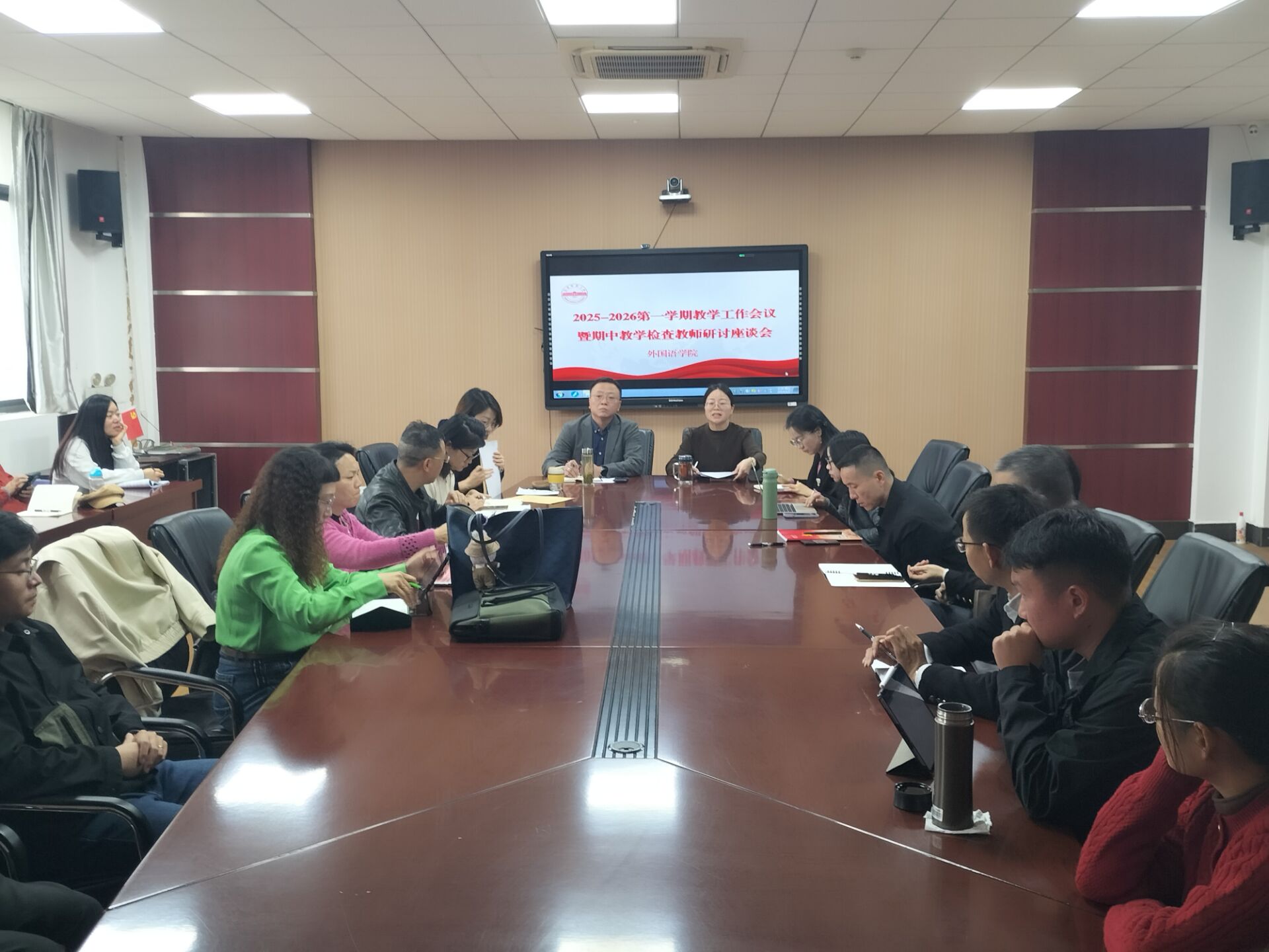 11月5日下午,beat365平台唯一官网在E304会议室和E314教室同步举行2025-2026学年第一学期期中教学检查教师研讨座谈会与学生评教座谈会。学院副院长黄全灿、瞿宁霞,各专业负责人、教研室主任、院级教学督导、AI课程负责人及骨干教师、新进教师代表参会;全校非外语类与外语类专业学生代表参加评教座谈。
