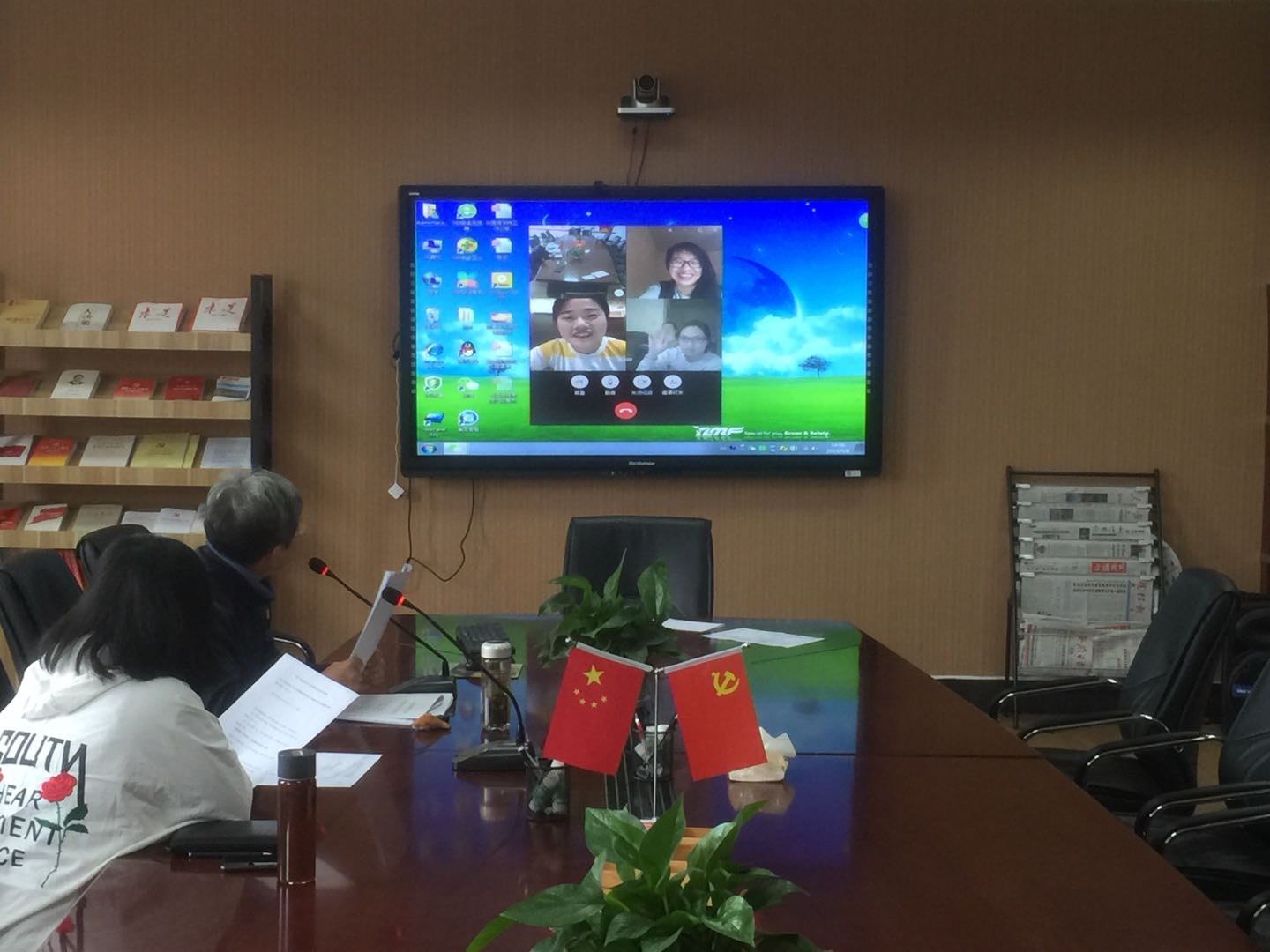 本次论文答辩从一场远程视频答辩开始。在学院多媒体会议室,由熊捍东副教授担任组长的远程答辩组,通过视频认真听取在美国拿撒勒和索尔兹伯里大学学习的四名英语(合作)专业毕业生对各自论文陈述后,就学生论文内容进行提问,做了答辩记录并评定答辩成绩。