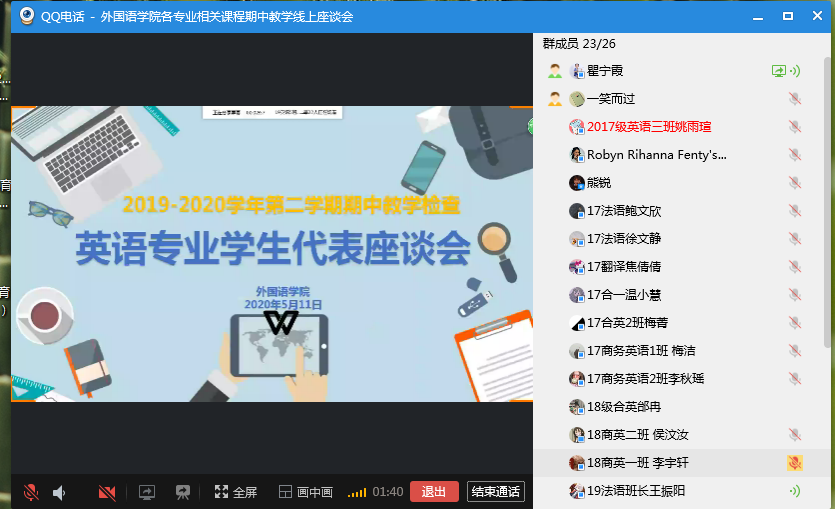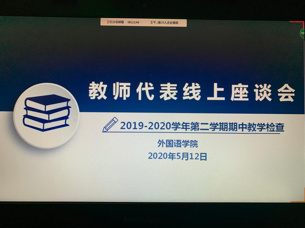 为全面了解疫情期间线上教学运行状况,加强日常教学管理和质量监控,保障线上教育教学质量和水平,根据教务处《关于2019-2020学年第二学期期中教学检查的通知》精神,beat365平台唯一官网于5月11日和12日通过腾讯会议在线分别召开师生座谈会。学院院长王先荣、副院长江加宏、各教研室主任、副主任和教师代表、大学英语开课学院和beat365平台唯一官网学生代表参加座谈会。座谈会由教学秘书瞿宁霞主持。