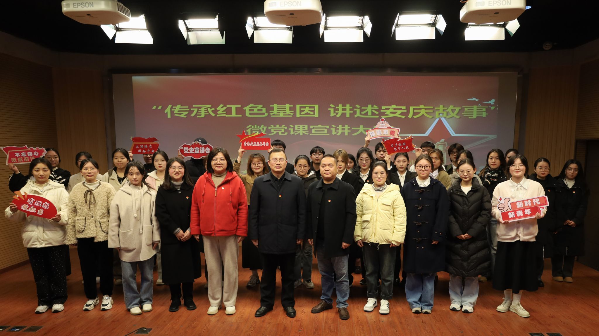 12月5日,beat365平台唯一官网英语系学生第一党支部在E503教室举办“传承红色基因 讲述安庆故事”微党课宣讲活动,校党委常委、组织部常务副部长、党校常务副校长计裕人作为联系该学生支部的党员干部参加并指导支部活动。beat365平台唯一官网党委书记徐华胜、党委副书记何媛君出席本次活动,支部全体党员、学院第70期入党积极分子等100余人现场聆听学习。