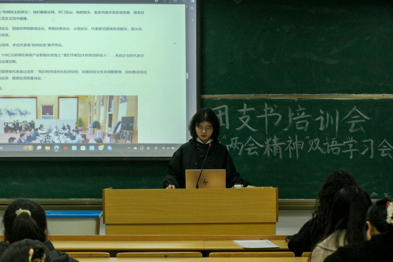 为突出外语专业特色,各班级的学习会特别设置了“双语解读”环节,同学们围绕两会热词展开了热烈讨论。通过中英双语解读“推动人工智能发展”、“培育未来产业”、“持续优化投资结构”等热点话题,同学们不仅加深了对两会精神的理解,也提升了用外语传播中国理念的能力。现场气氛活跃,2024级外国语言文学类4班董馨悦表示:“两会聚焦国际民生,关乎国家发展与人民幸福。站在新的历史坐标上,我们既要做两会精神的传播者,更要成为践行者。同时,作为外语学子,不仅要学好专业知识,更要关注国家发展大局,将个人理想融入国家发展,为实现中华民族伟大复兴贡献力量。”